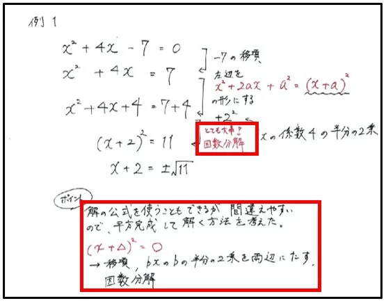 小テストやノート、ワーク提出がある場合、それで評価が大きく変わります。わかりやすく、丁寧に途中式を書くことはもちろん、そこにいろいろ書き込む工夫が必要です。下の例をごらんください。