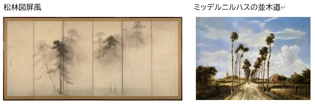 「ミッデルニルハスの並木道と比較してみて: どちらも身近な風景を描いているのに表現の仕方が全く違うことに驚いた。西洋の作品は、ありのままの風景を切り取ったように描かれているが、日本の作品は空白と墨の濃さを使って遠近感を出し、見る人に、空白の部分にも木があるように想像をさせている。表現し尽くさないという日本人の美の感覚がとても洗練されていてすごいと思った。茶わんやお皿のデザインでも西洋と日本で同じように違いがあるのか興味がわいたので調べてみたい。」
