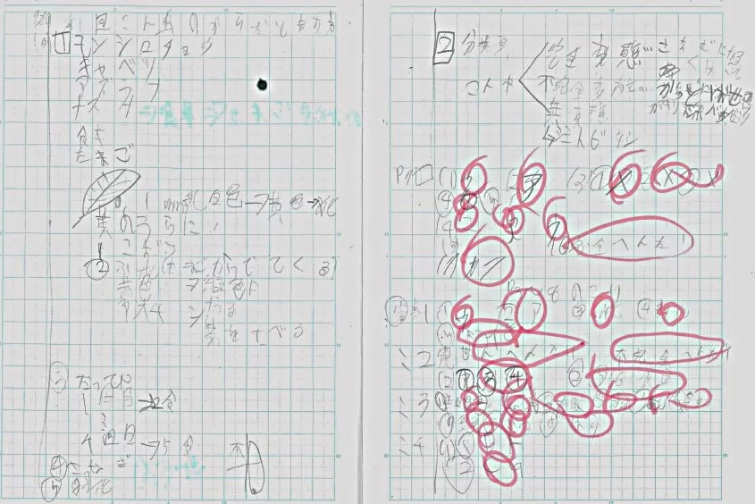 下に実際のノートをご紹介いたします。これは実際に指導した子のひとりが小学5年生に書いていたノート(理科)です。ちなみに、本人も自分の字で認識できないものが2割くらいあります。